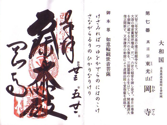 15:00西国観音霊場7番「東光山岡寺(龍蓋寺)」に参拝し御朱印を頂きました。