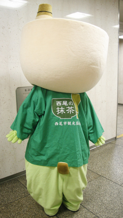 | おっとり穏やかなひょうきん者の男の子。 頭は抹茶茶碗と茶筅、茶杓の尻尾が生えています。 特技はお茶のお点前。抹茶、抹茶ミルク、グリーンティー、西尾産和菓子が大好き。 これまでは手作りの被り物でしたが、2010年11月に本格的な着ぐるみを作製しPR活動を行っています。 |