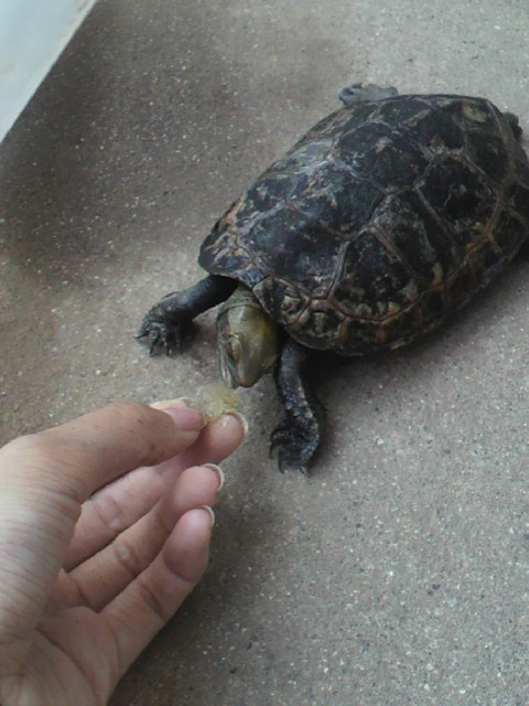 クーちゃんサイズ(甲長13cm)でも、餌と一緒に指を噛まれるとかなり痛いです!!
