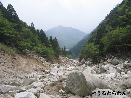 以前の大規模崩落で沢沿いがとんでもない事になってます。