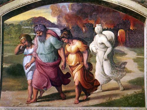 夜が明けると、御使い達はロトに言った。「あなたの妻と二人の娘を連れて逃げなさい。そうしなければ、あなたもこの町の不義の為に滅ぼされるでしょう。後ろを振り返ってはなりません。低地に立ち止まってはなりません。山に逃げなさい。そうしなければ、あなたは滅びます」。