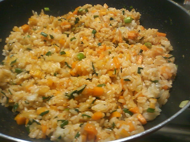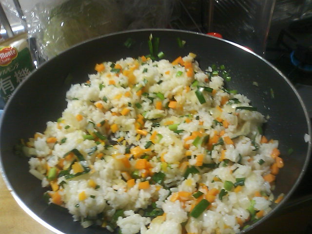 3 先に炒めたたまねぎとにんじんに、ごはんとにらを足して一緒に炒める