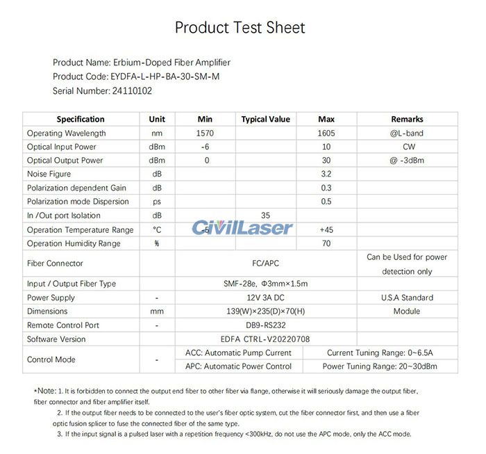 Cバンド アンプもカスタマイズできます。高出力 EDFA モジュールには冷却ファンが内蔵されています。ここでの入力および出力ファイバー タイプは SMF-28e で、PM ファイバーもカスタマイズできます。制御モードには、ACC (自動電流制御) と APC (自動電力制御) の 2 つがあります。アンプはソフトウェアで制御することもでき、リモート コントロール ポートは DB9-RS232 です。