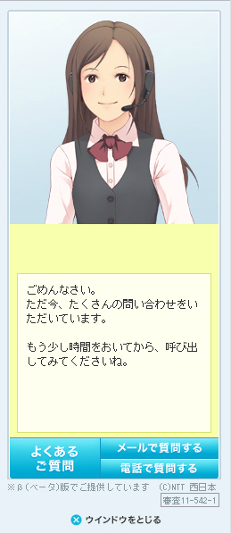 NTT西日本フレッツ光公式サイトコンシェルジュ「西野ひかり」さんが人気らしいです。質問を投げかけると答えてくれるらしい。試しに質問しようとアクセスを試みてみましたが、「ごめんなさい。ただ今、たくさんのお問い合わせをいただいています。もう少し時間をおいてから、呼び出してくださいね。」と、やさしく断られてしまいました。仕方ない、ご飯でもたべてからまたアタックしてみるか。