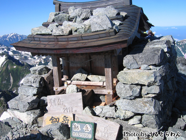 ついに剱岳山頂に登頂!立派なほこらがあります。富士山もうっすら見えました。