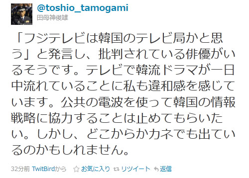 「フジテレビは韓国のテレビ局かと思う」と発言し、批判されている俳優さんがいるそうです。テレビで韓流ドラマが一日中流れていることに私も違和感を感じています。公共の電波を使って韓国の情報戦略に協力することは止めてもらいたい。しかし、どこからかカネでも出ているのかもしれません。」