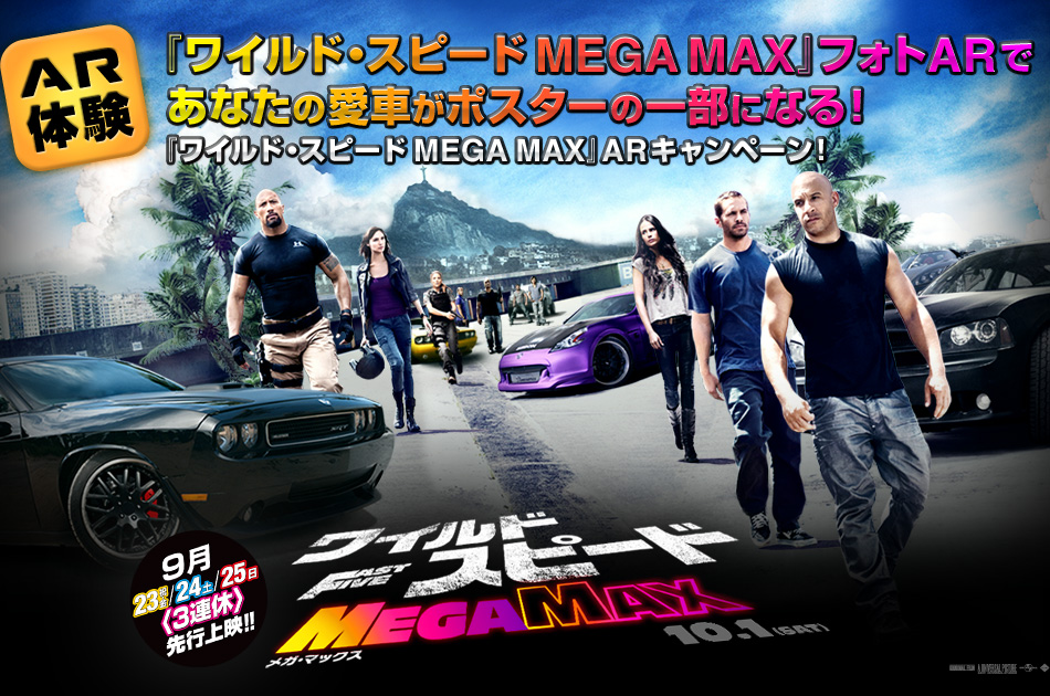 『ワイルド・スピード MEGA MAX』は東宝東和配給にて10月1日(土)から日本で公開されるユニバーサル・ピクチャーズのカーアクション映画です。スペシャルコンテンツは、アラプリを起動したスマートフォンでQRコードを読むことで、映画のポスター画像がフォトARとして出現します。