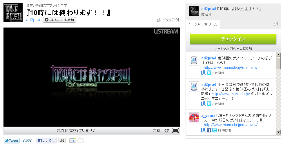 Ustream番組『10時には終わります!!』にマニアーナ!から「まゆみん」と「えこ」の2人が出演します。