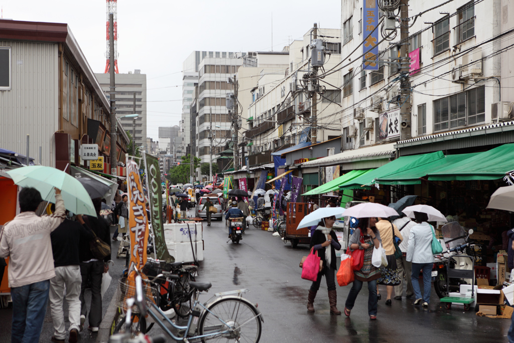 銀座の繁華街が近い。他の地方の卸売市場ではこのような立地条件はあまりない。