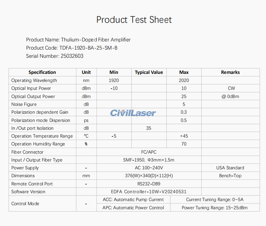 1920nm〜2020nm 25dbm TDFA SMファイバーアンプ
