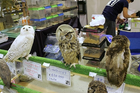 こちらは、猛禽類たち。真っ白なフクロウやミミズクなども販売されていました。