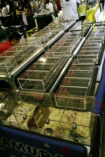 ↑ヘビ販売コーナー。1匹ずつヘビが入ったケージが、ひたすらずらりと続いてます。
