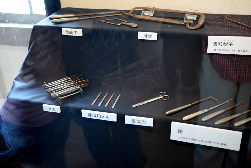 明治時代のメスやカンシなどの医療道具です。血液が付いた部分がさび付いています。間違いなく人間の血液です。生々しいです。