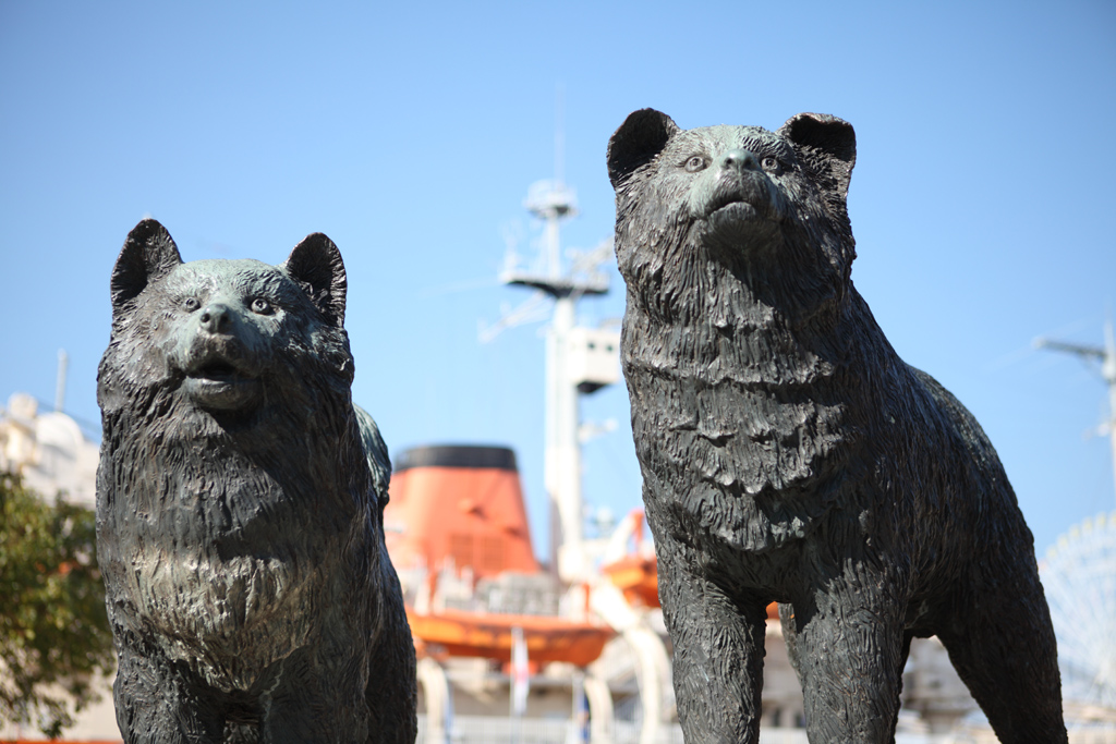 タロとジロ、後ろに見えるのは南極観測船フジ。こどもの頃に南極物語を読みましたが、この2匹は本当に賢い犬だと思います。