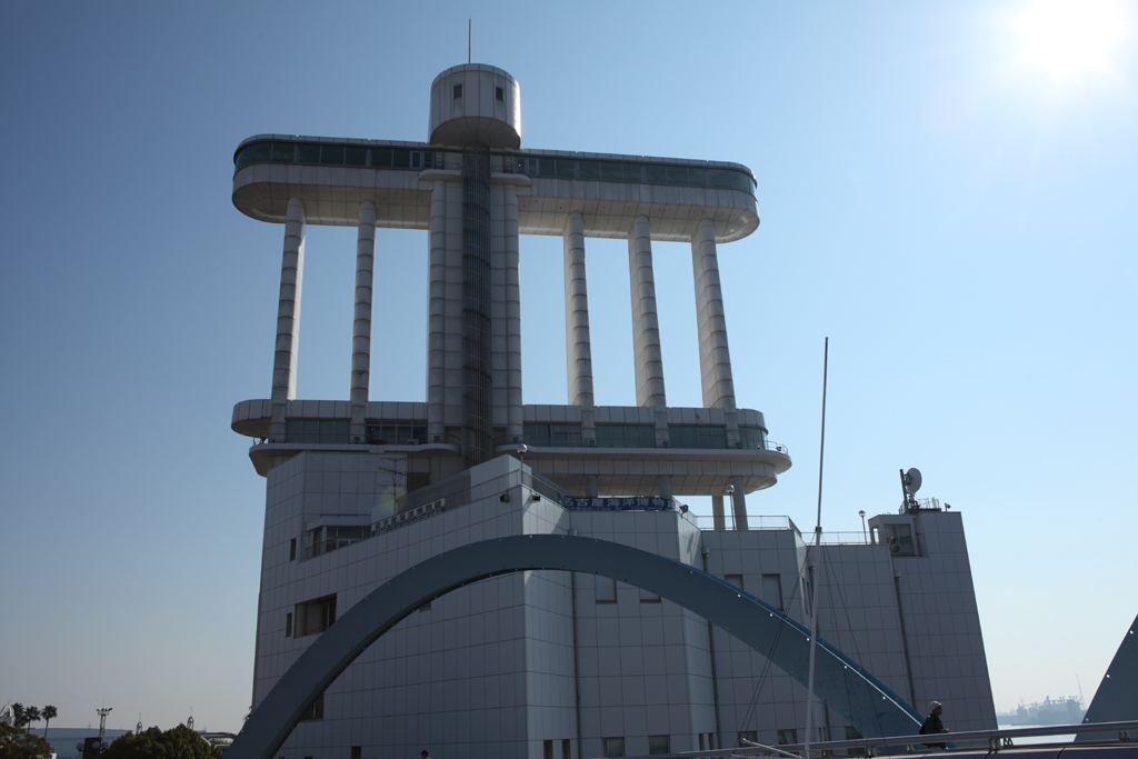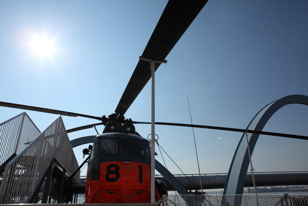 大空に羽ばたくプロペラ、逆光を切って撮影。右のアーチとの対比を考えてフレーミングしました(直線と曲線)