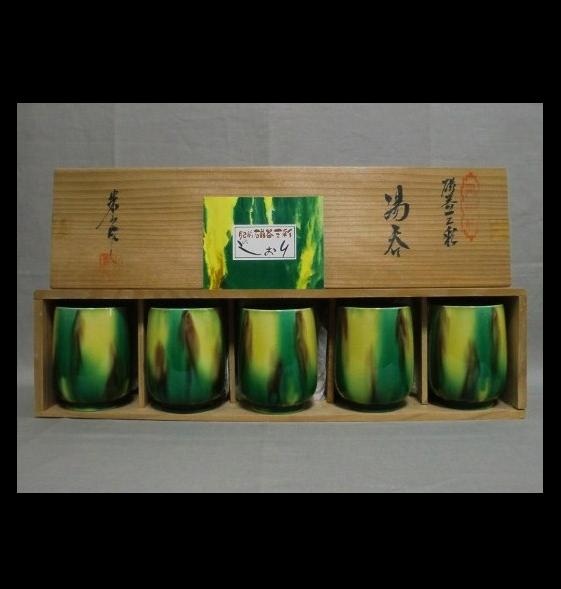 肥前 朱山作 磁器三彩の湯呑み茶碗5客 元箱・栞