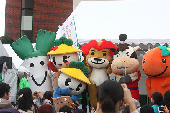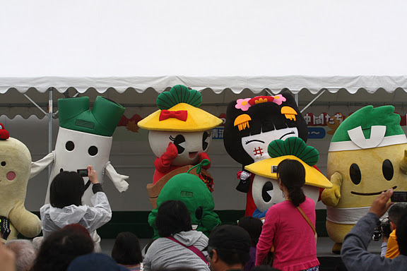 ↑ 【左から】わたる、ねぎっちょ(白)、かさまるちゃん・かさまるくん、やちにゃん、いなッピー