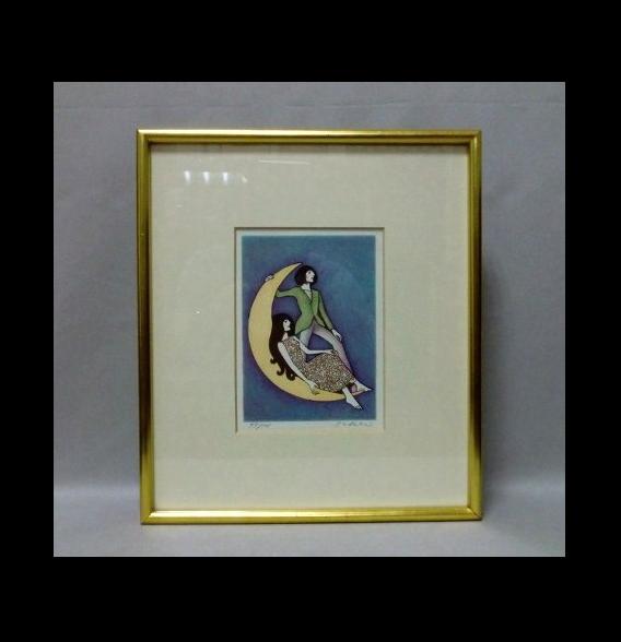 1970's (推定) 三日月に男女の画 リトグラフ