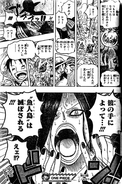 傷が開き血塗れのルフィは、ノアが止まりほっとして気絶!海王類達は、わずかに遅れたら魚人島は救えたがノアは完全に破壊されていたと話します。しらほし姫がルフィの力になりたいと強く願い、それを聞いた海王類達がルフィに力を貸したそうです!伝説の人魚姫しらほし姫がついに海王類を呼びました!