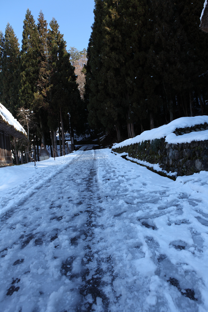 実は白川郷には、山の上に展望台たるものがありまして、正面の入口から入ると、自力で上がっていくしかありません。入口すぐの橋より徒歩20分の距離ですが、とちゅうから坂道になります。まったく雪が解けていません。アイスバーンを一歩づつ上がっていきます。