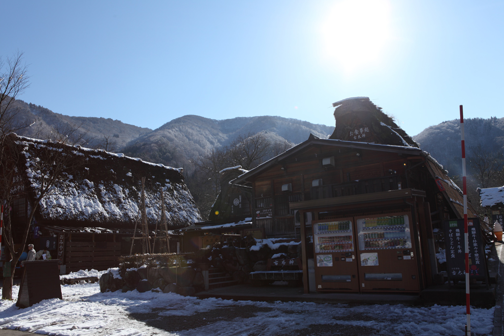 雰囲気はイイのですが、自動販売機は何とかして欲しいです。店の中に入れるとか、色を合わせるとか・・世界遺産に登録されているわけですから・・。素敵な白川郷を世界の方々に見てもらいたいです。