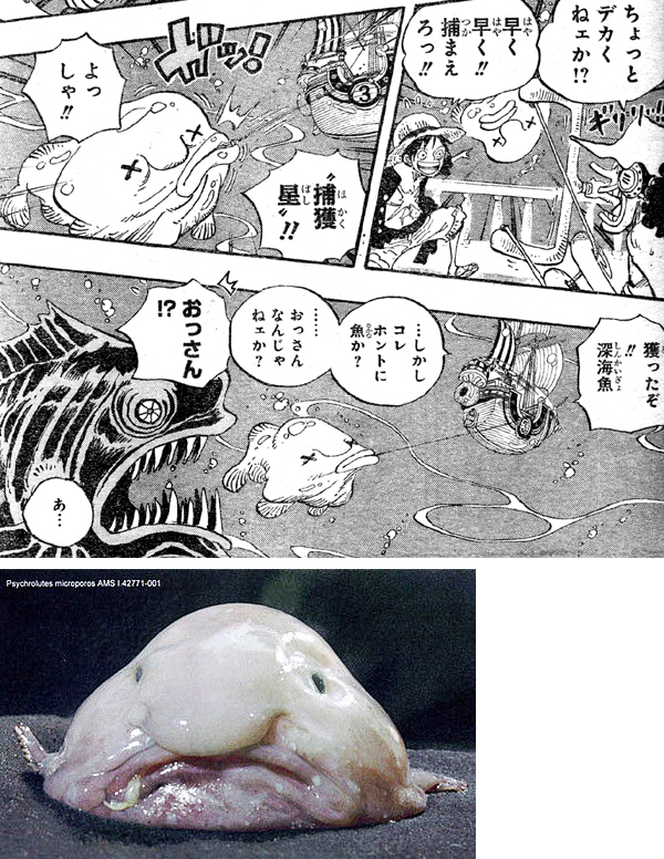 甲板ではウソップが釣り針をロープに結び、皆で巨大な深海魚を釣ろうとしています。ルフィはマヨネーズで食べたい魚をゴムゴムのJET銃で仕留め、ウソップが捕獲星で捕えました。その おっさんみたいな魚を大きな深海魚が食べ、それをさらに大きな深海魚が食べてしまい、ゾロが三百六十煩悩鳳で仕留めました!