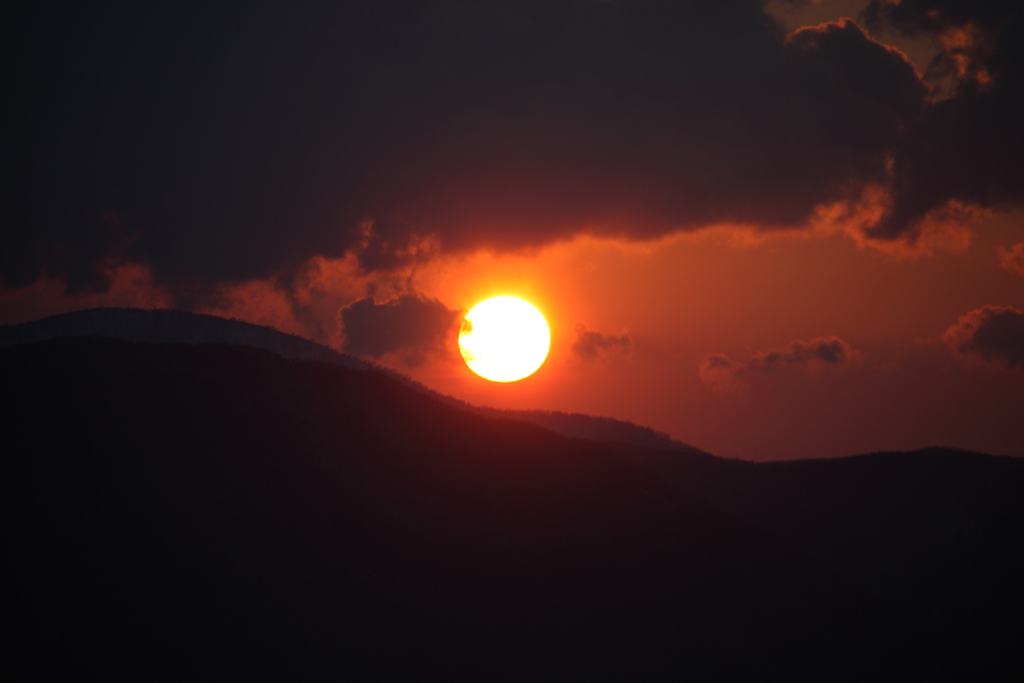 西の空に沈みつつ太陽。こうした撮影にはフィルタをいれるともっと燃えるような赤色がでます。