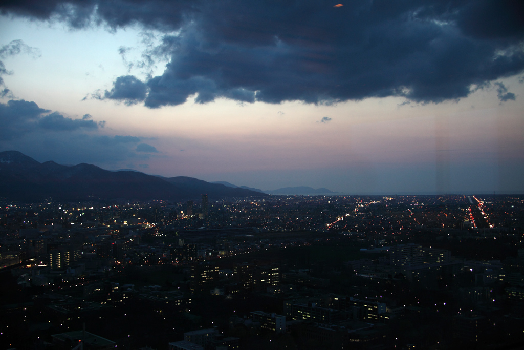 北海道の平野の向こうには小樽の海が広がっています。もうじき真っ暗になるまえの自然のグラデーションです。