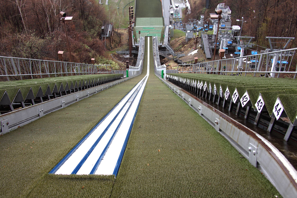 今回も大倉山シャンテからの紹介ですが、いよいよ滑走開始地点からの写真です。選手の目線にカメラを合わせてみました。殆ど絶壁です。その昔、囚人の刑罰として行われたというのもうなずけます。