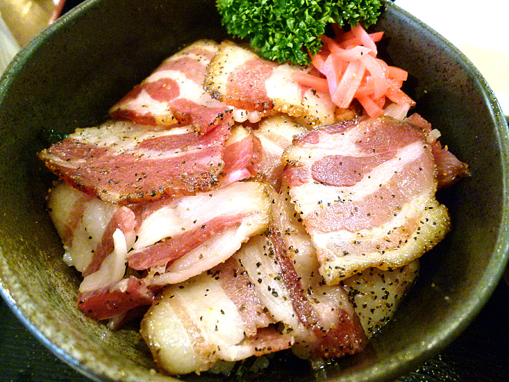ベーコン丼。北海道は海鮮も美味しいのですが、ソーセージやベーコンもとても美味しいのです。それで丼を作ってしまうという発想に驚きです。