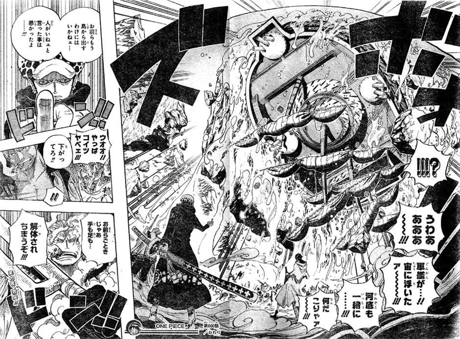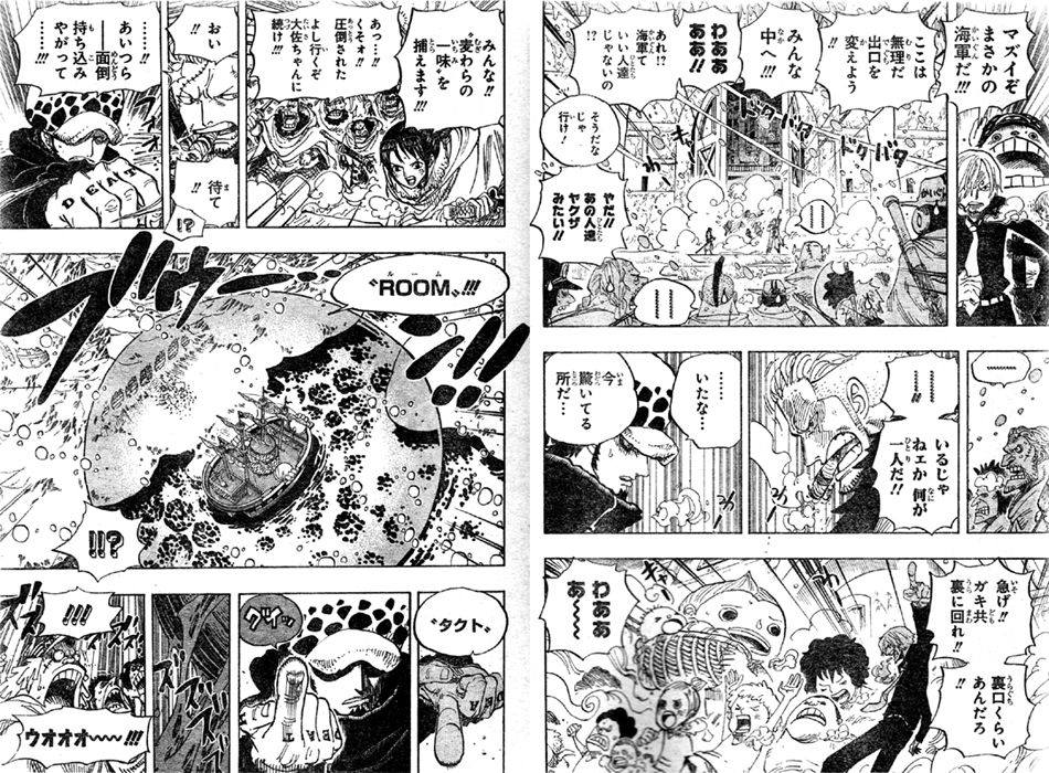 サンジはスモーカーに気付き、ヤクザのような海軍G-5を嫌がる子供達を誘導し裏口から出る事に!麦わらの一味を捕らえようとする たしぎ達をローが止めます!ROOM タクトで軍艦を河底ごと宙に浮かせました!海軍をもう島から出すわけにはいかない、人がいないと言った事は悪かったと言います。ローに対峙するスモーカー!