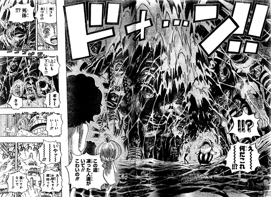 パンクハザード研究所内では、ナミとチョッパーが子供達と走っています!子供達は一年の治療だと騙されてパンクハザードの人達に誘拐されて来たっぽいですね!チョッパーが扉を開けたドアの中は寒くて暗く、上にも下にも氷づけの死体(?)が!恐ろしい形相の人や囚人服のような格好の人がいますね。強い悪人が多そうな様子!M(マスター)が捕まえさせた海賊でしょうか?