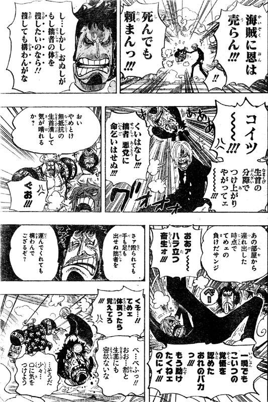 パンクハザード研究所内ビスケットルームでは、サンジ達が道を塞ぎ終えています。羊のような角が生えた人達は下半身も羊でした!またもや空想上の生物の姿!生首侍は逃がした子供達の中に息子はいなかったと言い、助けるため自分だけ残ると言いますが、体が無く動けないのに 体を捜してくれと海賊には死んでも頼まないと言い張ります。覚悟を認め連れ出してくれたサンジにつけ上がる生首侍!サンジは生首侍をボコボコにしつつも体を捜してあげることに!優しいですね!