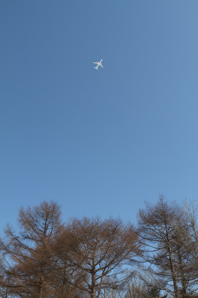 白樺の木を少しだけ残して、空高く飛行している飛行機を撮影してみました。高さを思いっきり強調しています。