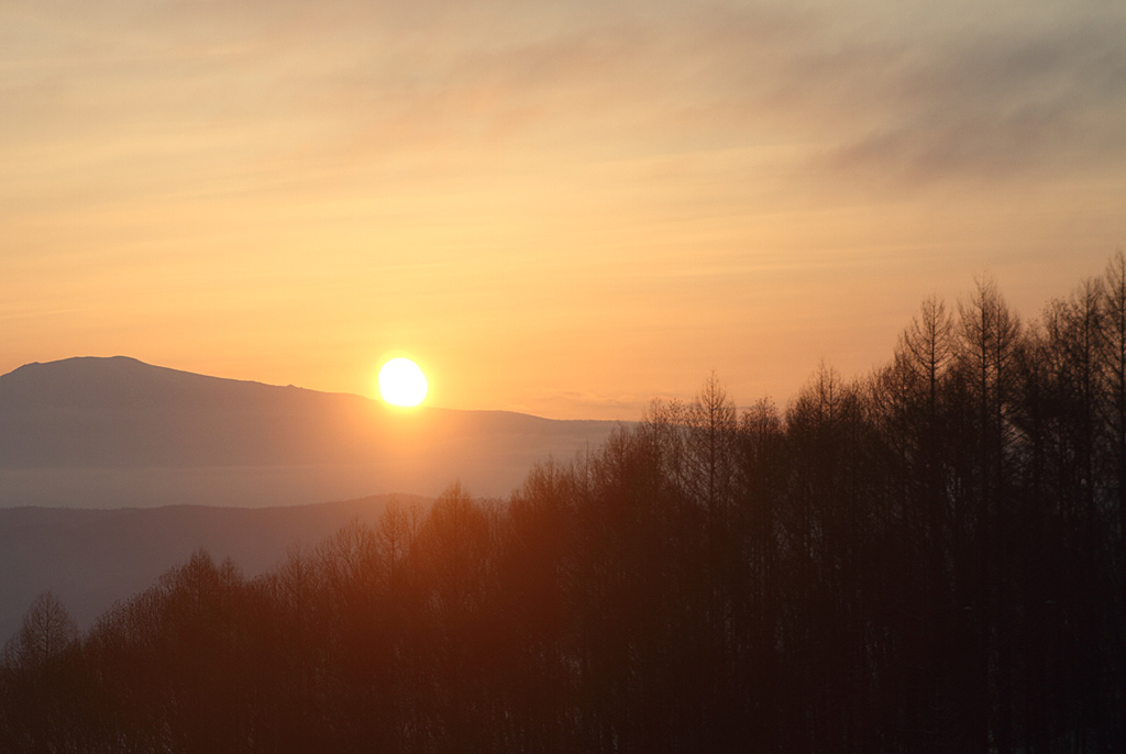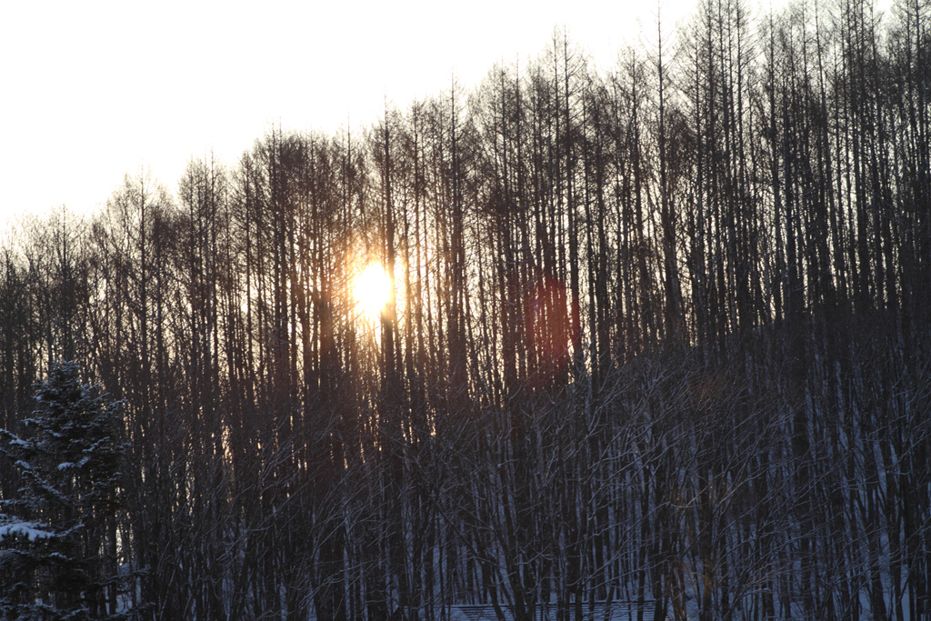 これはちょっと冒険をしてみました。白樺の林から朝日を抜いてみました。日の丸構図にならないようにちょっと構図にも注意して撮影。きっちり絞って全体に白樺をきっちりピンをいれています。
