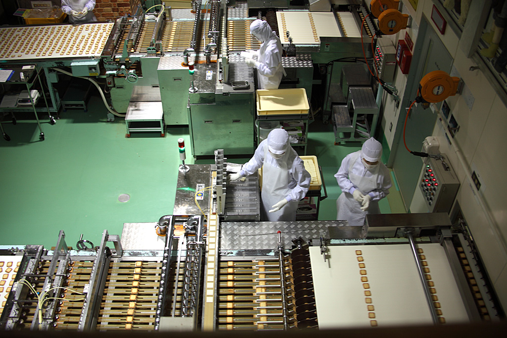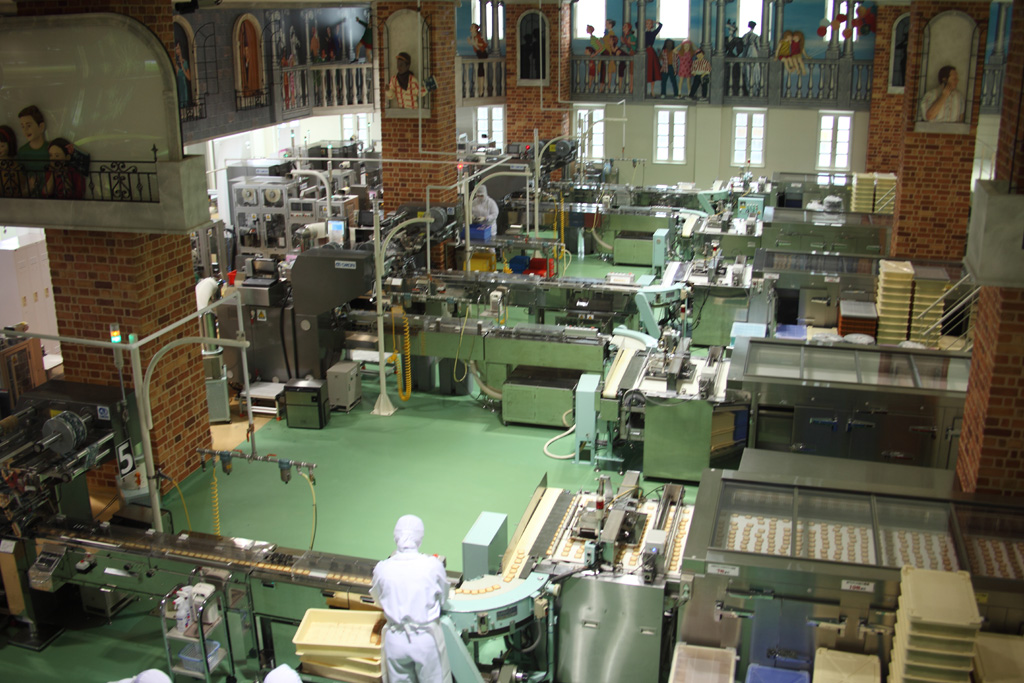 お菓子がどんどん出来上がってきています。工場は殆どオートメーション化されており、人はあまり多くありません。