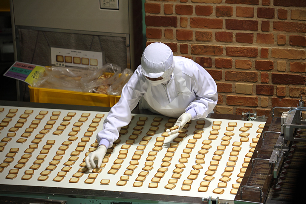 完成した白い恋人が流れてきています。後は箱づめされて出荷されていきます。