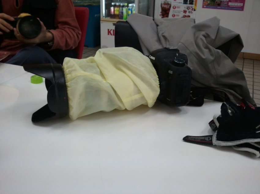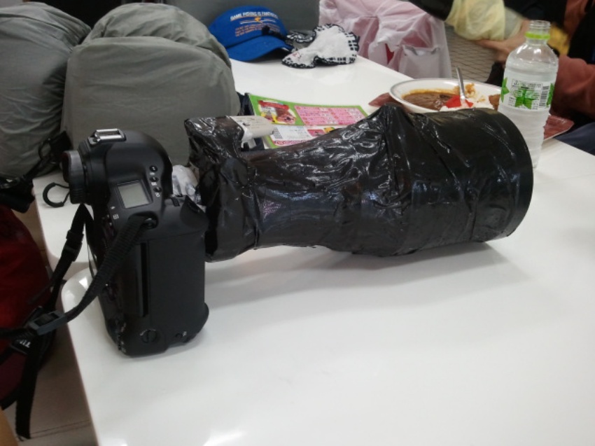 レンズはサランラップでぐるぐる巻き。さらに布テープ(PPテープ)でぐるぐる巻きです。もともとはキャノンの白いレンズですが・・黒いレンズになっています。ボディは1D4なので、完全防水のためノーガードです。