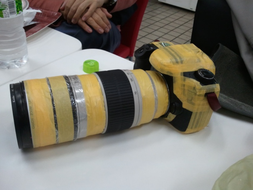 レンズはサランラップぐるぐる巻きです。AFやISなどのボタンも制限されますが、防水力は格段に上がります。拠点拠点は模型用のマスキングテープで補強してあります。本体も同じくマスキングテープで使用しないボタンをすべて封印してあります。何かキャノンのテストマシンのようです。