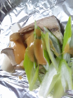| 1 酢味噌をサバとネギの上に少しかけ、 アルミホイルで包みます。 酢味噌は 味噌:酢:砂糖:みりん:酒 =3:2:1:1:2 の割合で作りました(^o^)/ | |