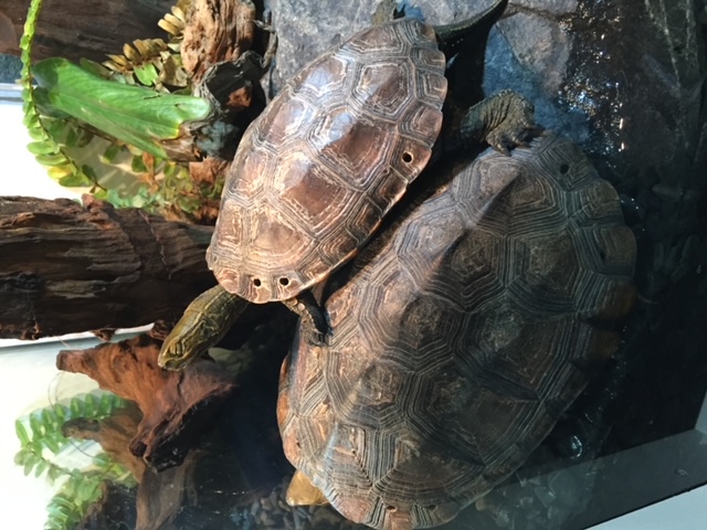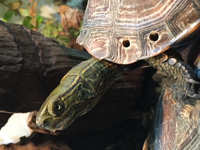 2018年・名古屋港水族館の「カメ展」にいたウンキュウ。顔と脚はイシガメ・甲羅と模様はクサガメです。いろいろなバリエーションがあります。