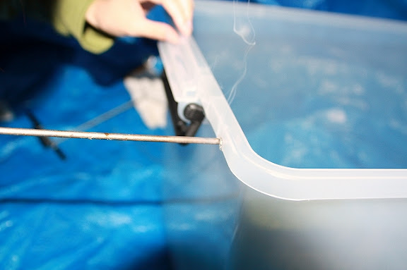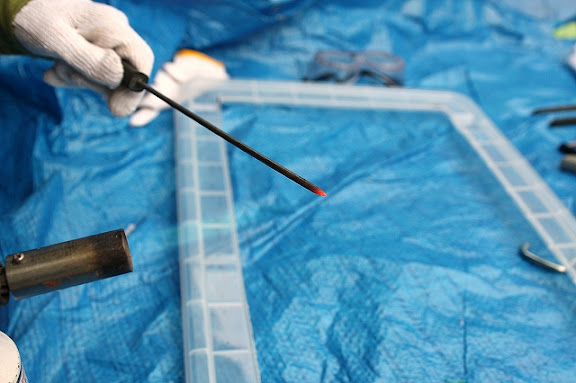 キリをバーナーで熱して、金網を固定するための穴をあける!!