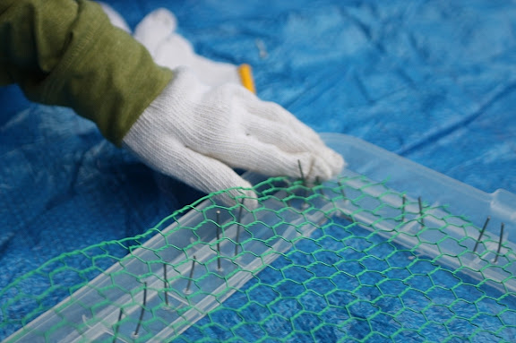 全部通したあとで、金網をかぶせて固定していきます。