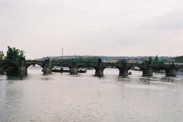 カレル橋(写真中)は石でできた橋で、小さめのアーチがいくつも並んでいます。
