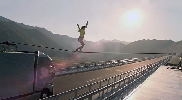 撮影が行われた場所は、クロアチアのハイウェイ。2台のFHは上りと下りの両車線を時速80kmで並走し、その先にはトンネルが待ち構えている。ところが、トンネルは上りと下りで別々に掘られているため、真ん中はつながっていない。つまり、ディッキーは、トンネルに行き着くまでに綱を渡りきらないとトンネルの仕切りに激突してしまうのだ。
