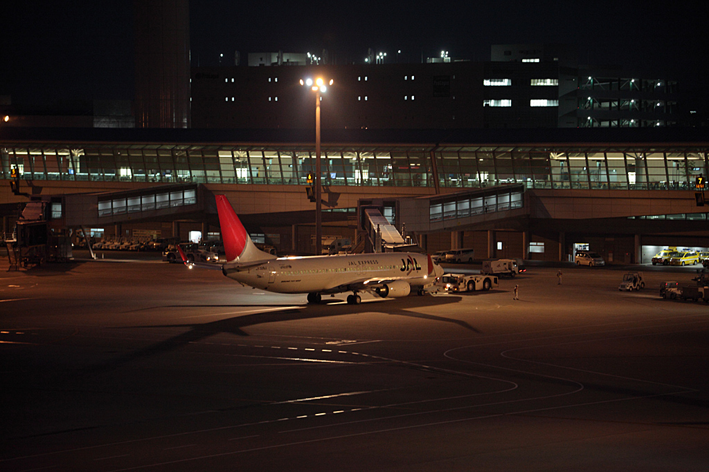 JALの美しい白い機体です。後ろのターミナルの柱まできっちりピントが入っているため、後ろがちょっとうるさい感じにも取れます。飛行機には数百人の人が乗機しており、それぞれに想いがセントレアに入っていきます。