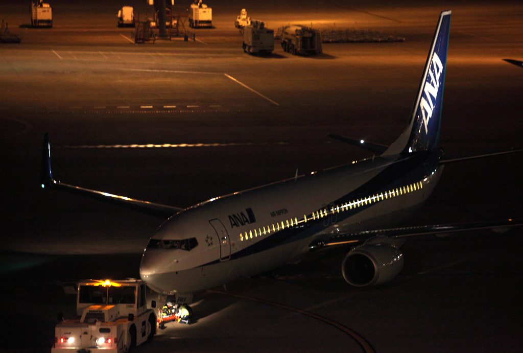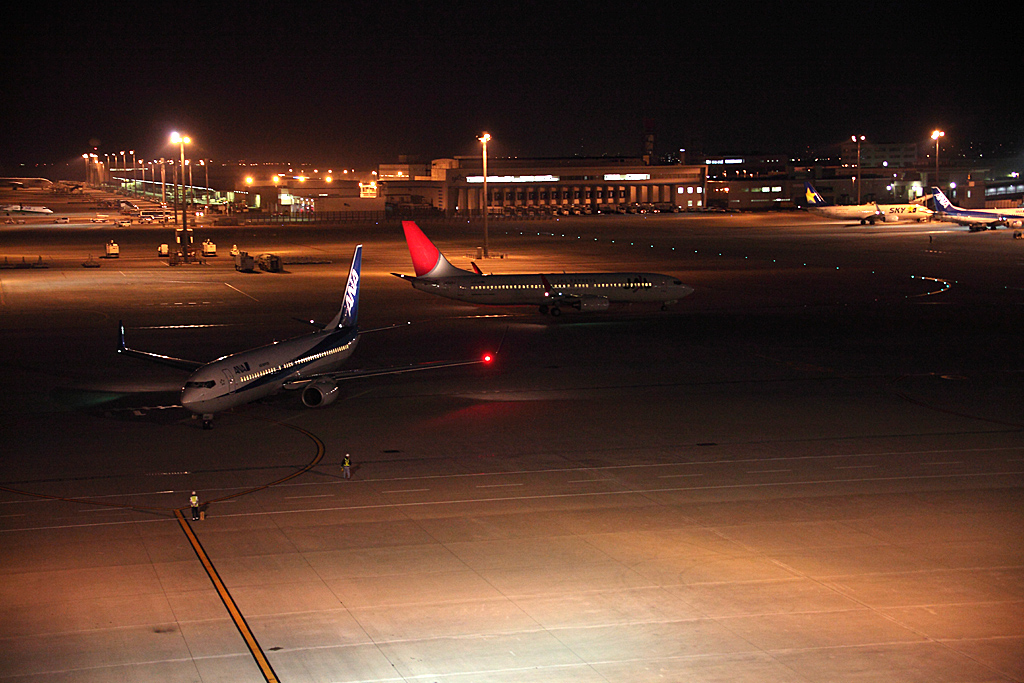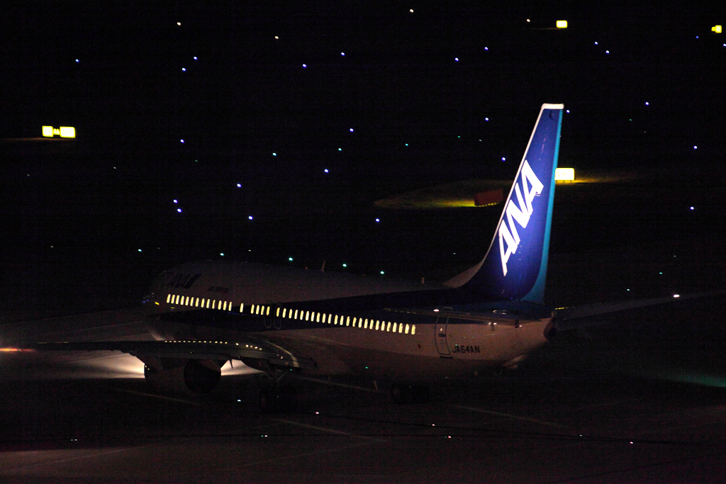 後ろの誘導灯がまるで星のようですね。無論、地上を滑走中ですが、なんか宇宙空間を飛行しているようなイメージに撮影できました。望遠効果によって周りのよぶんなものも写りこまず表現力が増したように思えます。