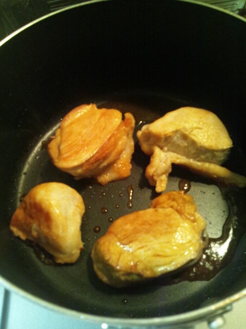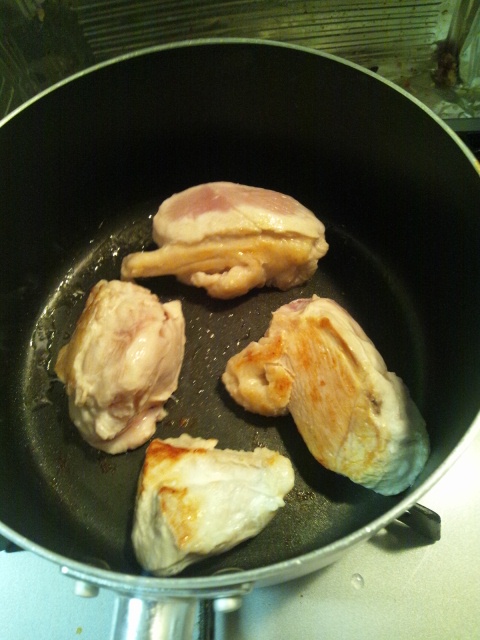 | 1 まず、むね肉を適当な大きさに切り分けます。 あまりにも大きいと火が通りにくいので そこに注意です! そして、油をひかずに焼いていきます♪ | |
