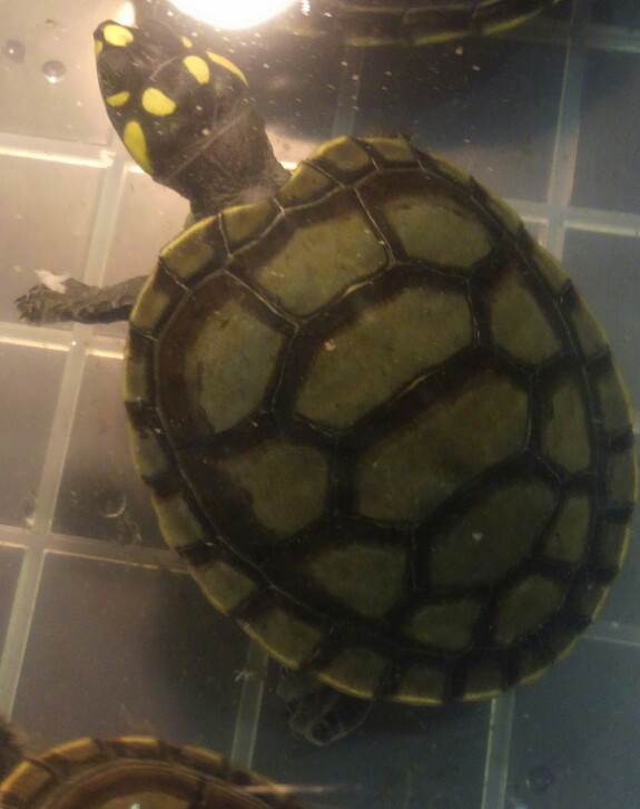モンキヨコクビガメは、南米に生息する曲頸類のカメ。頭の黄色い斑点(スポット)が特徴的です。