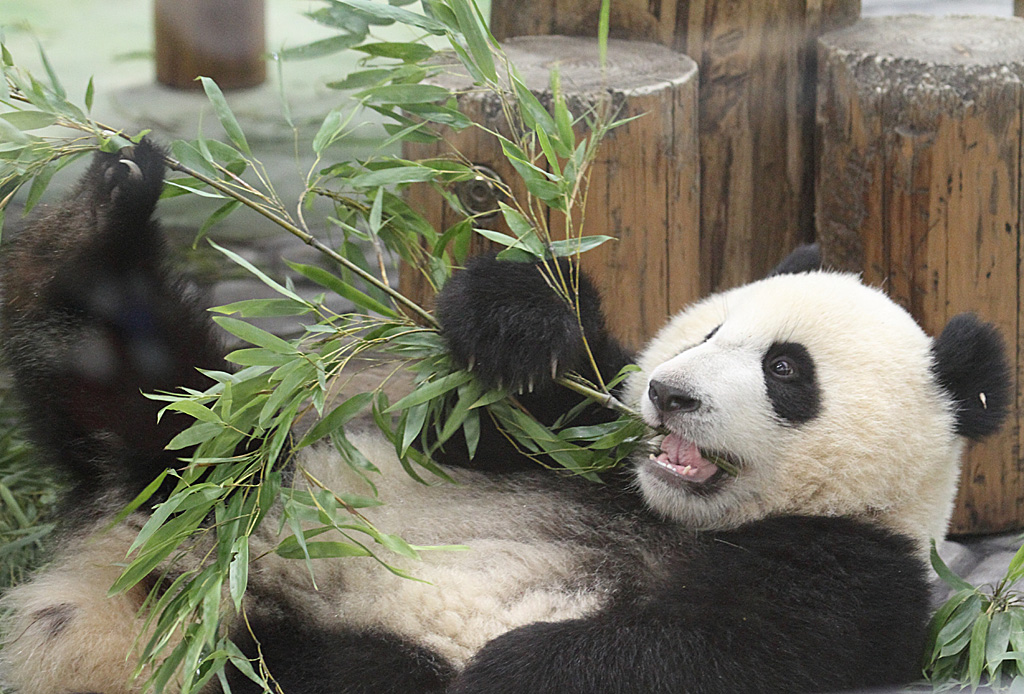 ガシガシ食べています。パンダはやはり笹が好物のようですが、果物なども好んで食べるそうです。大きくなってもこういう姿をみるとどことなく愛嬌があります。